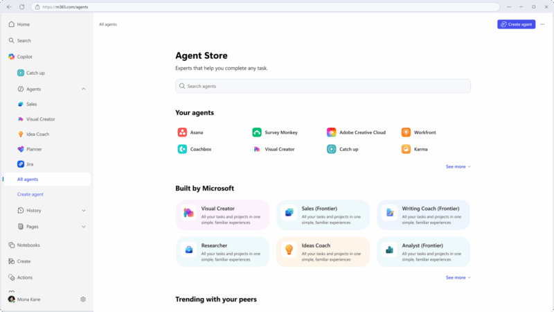 W sklepie z agentami pojawią się Badacz (Researcher) i Analityk (Analyst), którzy rozszerzą możliwości Copilota dla firm, przy czym są dostępni w ramach pakietu Copilot dla firm 😅. Pojawią się też agenci firm trzecich, m.in. Jira, Monday.com oraz Miro, będzie można też dodawać tam agentów firmowych, dostępnych wewnątrz organizacji.